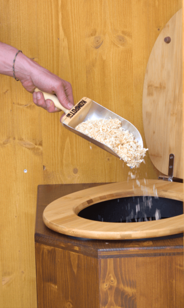 👉 Eine Trockentoilette ist eine Toilette, die ohne Wasserspülung und dafür mit Einstreu funktioniert.